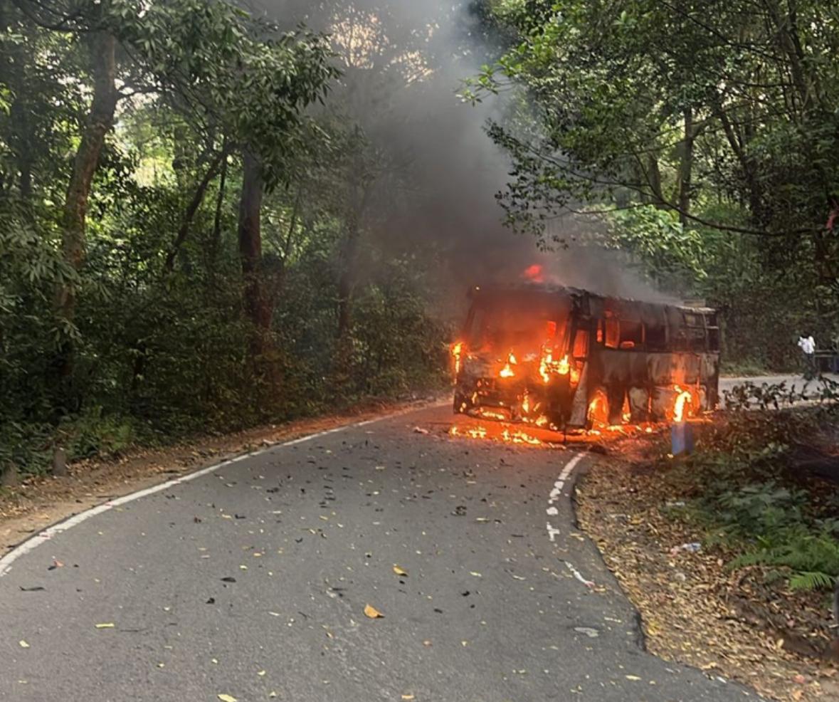 ഇരിട്ടി (കണ്ണൂർ) ∙ വിരാജ്പേട്ട റൂട്ടിൽ മാക്കൂട്ടം ചുരം പാതയിൽ സ്വകാര്യ ബസ് കത്തി നശിച്ചു. ഇന്ന് പുലർച്ചെ ആറ് മണിയോടെയാണ് തീ പിടിത്തമുണ്ടായത്. വിരാജ് പേട്ടയിൽ നിന്ന് കണ്ണൂരിലേക്ക് യാത്രക്കാരില്ലാതെ വരികയായിരുന്നു ബസ്. തീപിടിച്ച ഉടൻ ജീവനക്കാർ ഇറങ്ങി ഓടിയതിനാൽ ആർക്കും പരുക്കില്ല. അഗ്നിരക്ഷാ സേന എത്തി തീയണയ്ക്കാൻ ശ്രമിച്ചെങ്കിലും ബസ് പൂർണമായും കത്തി നശിച്ചു. അപകടത്തെ തുടർന്നു ചുരം റോഡിൽ ഏറെ നേരം ഗതാഗതം സ്തംഭിച്ചു.