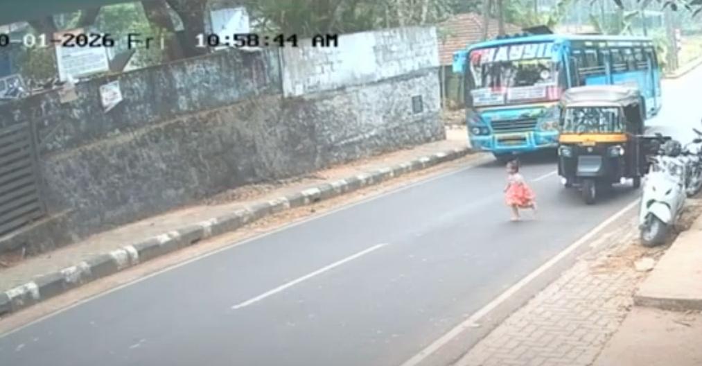 കോഴിക്കോട് ∙ കൊടിയത്തൂരിൽ റോഡിലേക്ക് ഓടിയ മൂന്നു വയസ്സുകാരി സ്വകാര്യ ബസ്സിനടിയിൽ പെടാതെ അദ്ഭുതകരമായി രക്ഷപ്പെട്ടു. കോഴിക്കോട് കൊടിയത്തൂർ റൂട്ടിലോടുന്ന ബസ് ഡ്രൈവർ സിനോജിന്റെ ഇടപെടലാണ് വലിയൊരു ദുരന്തം ഒഴിവാക്കിയത്. അച്ഛനൊപ്പം ഓട്ടോയിൽ വന്നിറങ്ങിയ കുട്ടി റോഡിനു മറുവശത്തുനിന്ന ബന്ധുക്കളുടെ അടുത്തേയ്ക്ക് ഓടുകയായിരുന്നു. കഴിഞ്ഞ വെള്ളിയാഴ്ചയാണ് സംഭവമുണ്ടായത്. കുട്ടി അപകടത്തിൽനിന്നും രക്ഷപ്പെടുന്ന വിഡിയോ പുറത്തുവന്നു.